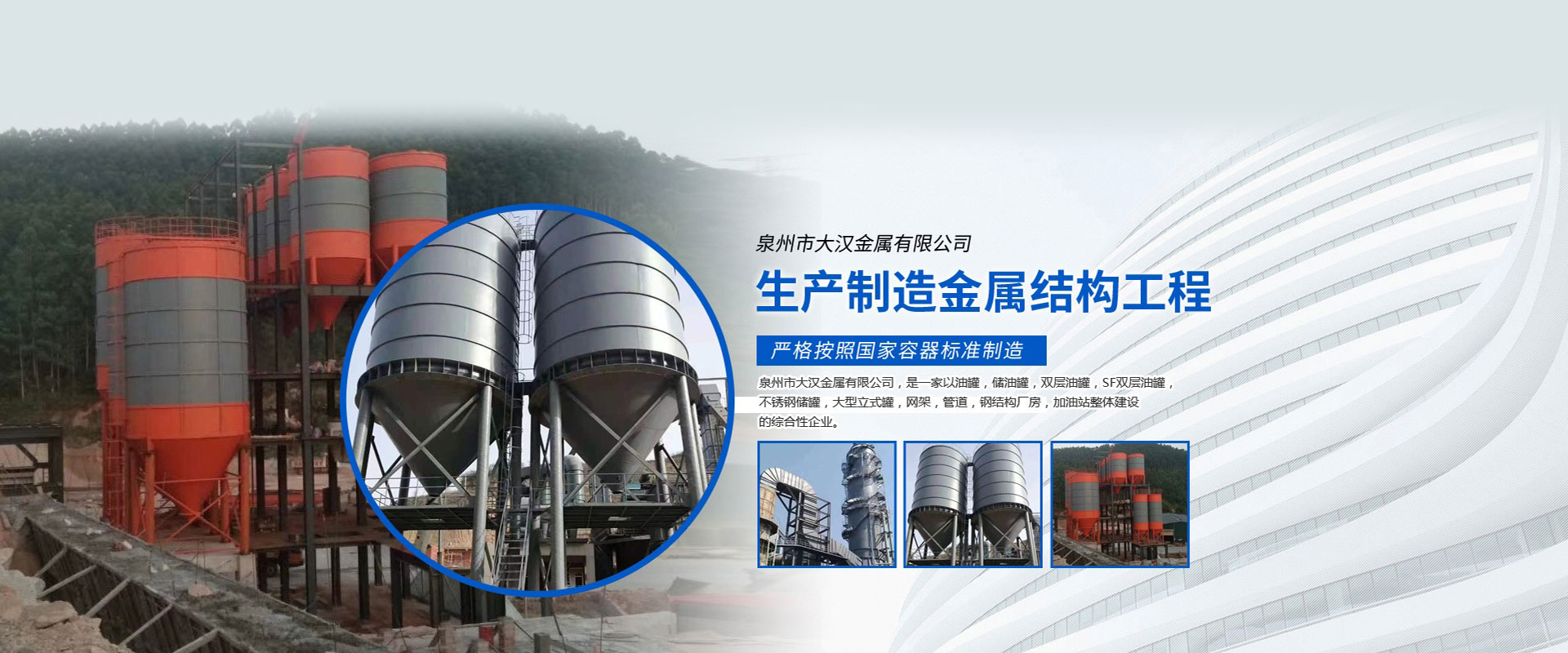泉州市大漢金屬有限公司,是一家以油罐、儲(chǔ)油罐、雙層油罐、SF雙層油罐、不銹鋼儲(chǔ)罐、大型立式罐、網(wǎng)架、管道、鋼結(jié)構(gòu)廠房、加油站整體建設(shè)的綜合性企業(yè)。本公司以技術(shù)人員、施工經(jīng)驗(yàn)豐富的工程隊(duì)、自動(dòng)化設(shè)備、擁有鋼結(jié)構(gòu)建筑、螺栓球網(wǎng)架設(shè)計(jì)安裝技術(shù)力量,嚴(yán)格按照國家容器標(biāo)準(zhǔn)制造,是一家產(chǎn)品開發(fā)并生產(chǎn)各種壓力容器和制造金屬結(jié)構(gòu)工程,化工石油工程安裝的大型企業(yè)。近多年來,以質(zhì)量穩(wěn)定、客戶至上、信譽(yù)為本,以科技求發(fā)展,贏得廣大客戶支持與信賴。